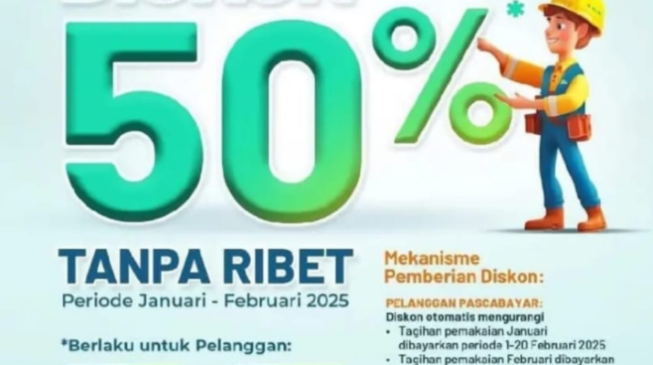Mekanisme Pemberian diskon untuk pelanggan prabayar langsung pada saat pembelian pulsa token listrik Januari 2025 dan Pebuari 2025. Sedangkan pascabayar diskon otomatis mengurangi tagihan rekening pemakaian Januari 2025 dibayarkan periode bulan Pebuari 2025, tagihan rekening pemakaian Pebuari 2025 dibayarkan pada bulan Maret 2025.
