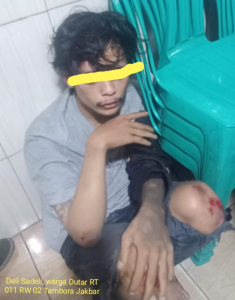 Ketika DS berada jalan Tanser Raya, sejumlah pengendara motor yang melintas spontan berhenti kemudian menghajar beramai ramai hingga babak belur wajah DS berlumuran darah.
