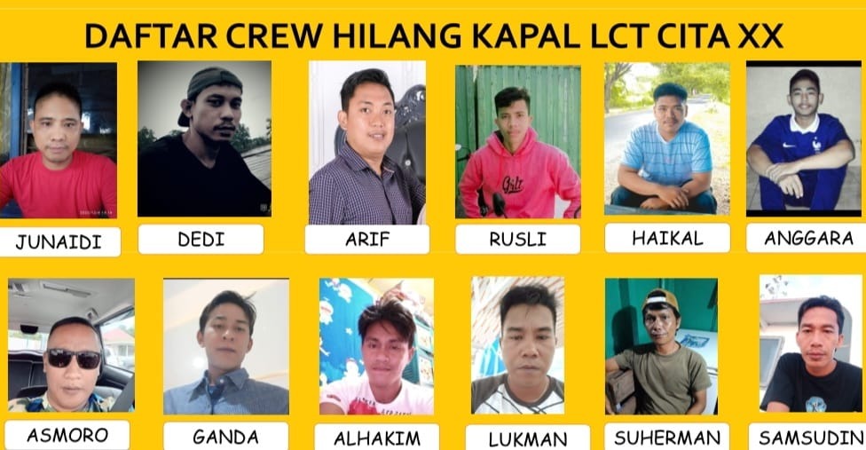 Kapal LCT CITA XX dilaporkan hilang kontak sejak 17 Juli 2024 di perairan Papua. Kapal tersebut membawa 12 orang awak kapal dan penumpang dan hingga kini belum ditemukan.