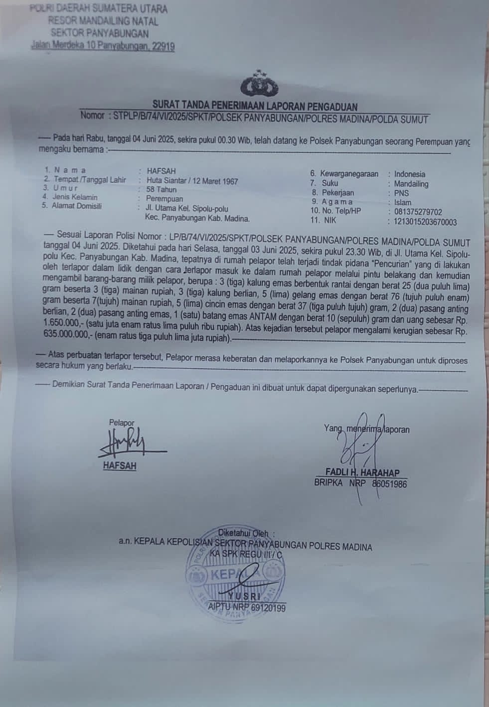 Dengan laporan ke Polsek panyabungan no LP / B/ 74/ Vl /2025/SPKT/ Polsek Panyabungan / Polres Kab Madina.