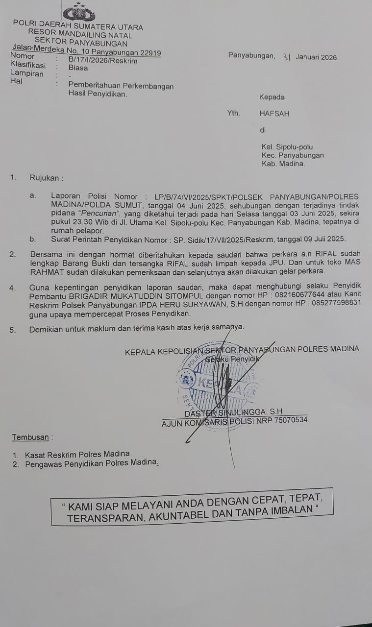 Saat di konfirmasi pihak Polsek panyabungan penyidik pak muktar kamis 11-02 – 2026 belum ada jawaban sehingga rilis berita di kirim ke pemred warta polri Jakarta pusat.